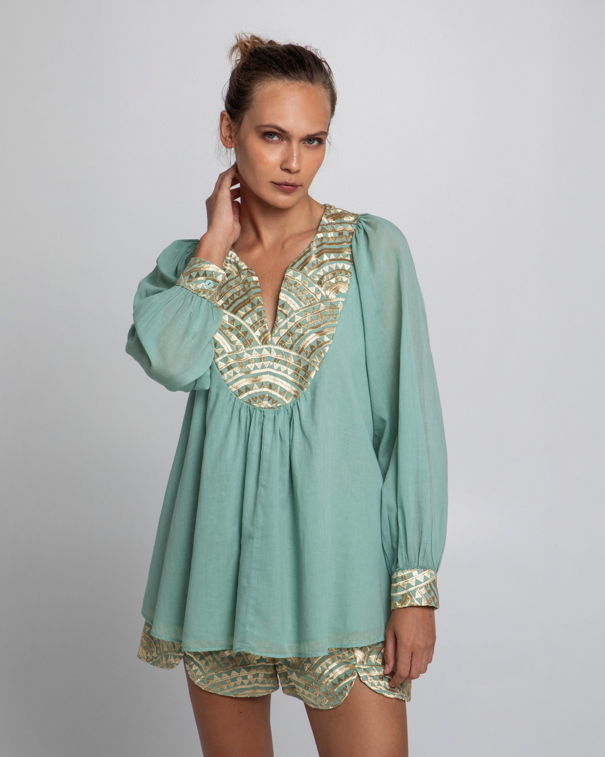 Μπλούζα από βαμβακερό ύφασμα. Αυτό το κομμάτι διαθέτει χαλαρή γραμμή, V λαιμόκοψη, μακριά μανίκια και εντυπωσιακά κεντήματα σε ένα μοναδικό χρυσό γεωμετρικό μοτίβο. Έμπειρα κατασκευασμένη με ένα άγγιγμα ιστορίας και παράδοσης, αυτή η μπλούζα θα αναδείξει κάθε ντύσιμο.