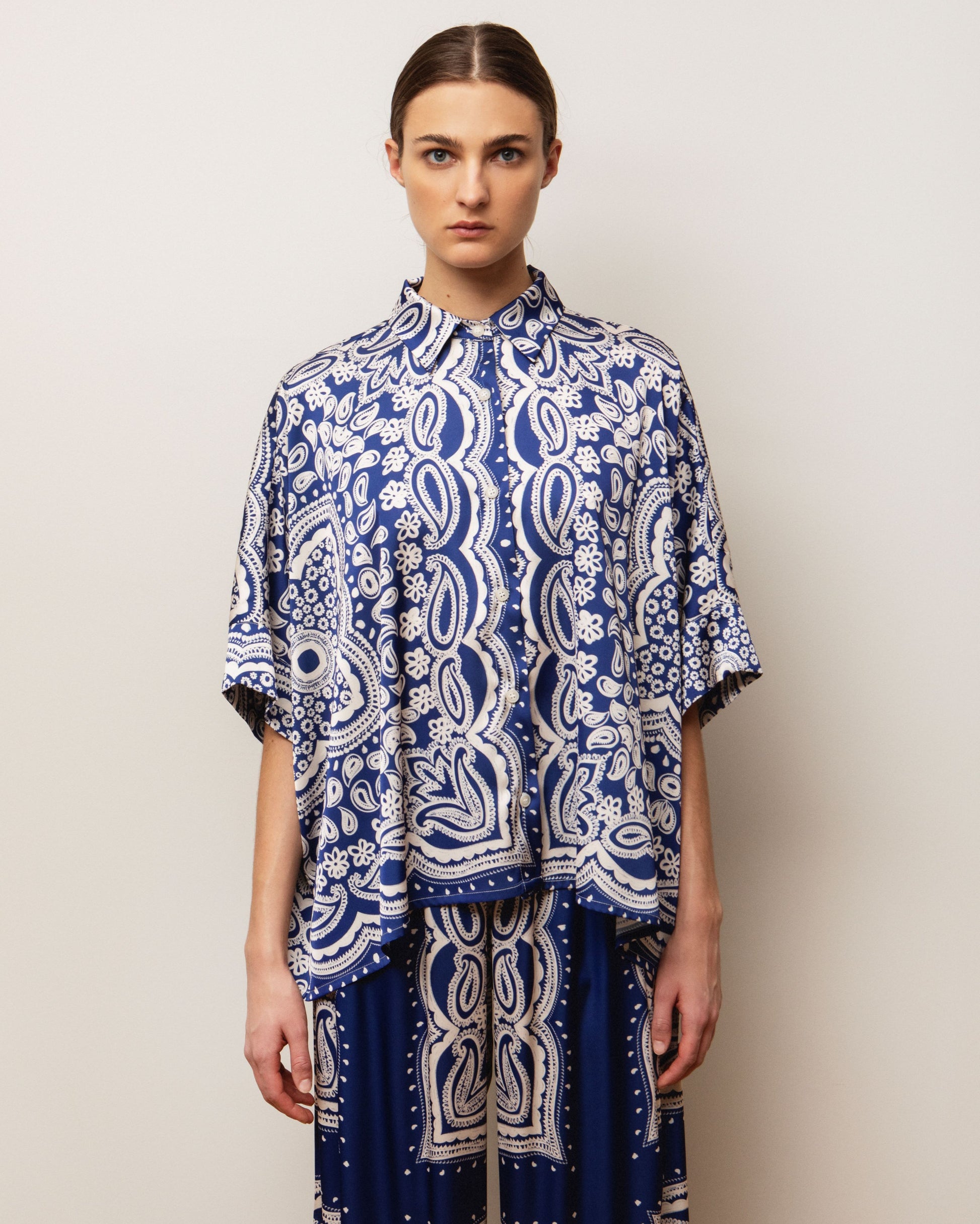 Αναβαθμίστε το στυλ σας με αυτό το άνετο, μεγάλο πουκάμισο, ιδανικό για αβίαστα κομψές εμφανίσεις. Με κλασικό γιακά, μπροστινό μέρος με κουμπιά και εντυπωσιακό μπλε paisley print, αυτό το πουκάμισο φέρνει μια boho-chic ατμόσφαιρα σε κάθε ντύσιμο. Το ελαφρύ και αναπνεύσιμο ύφασμά του το καθιστά μια ευέλικτη επιλογή για όλες τις εποχές.